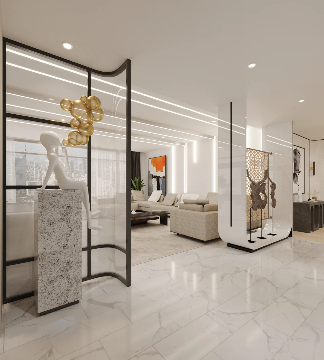 - แสงสว่าง (Lighting) การออกแบบแสงสว่างที่ดีมีความสำคัญไม่แพ้กัน ควรมีการผสมผสานแสงหลายประเภท ทั้งแสงธรรมชาติ แสงไฟหลักเพื่อให้ความสว่างทั่วไป (Ambient Light) แสงไฟเฉพาะจุดสำหรับการทำงานหรืออ่านหนังสือ (Task Light) และแสงไฟตกแต่งเพื่อสร้างบรรยากาศ (Accent Light) เช่น ไฟซ่อนฝ้า ไฟส่องภาพ หรือโคมไฟตั้งพื้นดีไซน์เก๋
